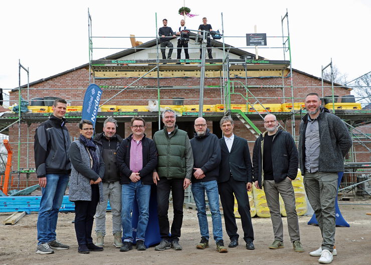 Freuten sich über das Richtfest beim Neubau des Schul- und Internatsverbundes Bethel im Norden in Deckertau (v.l.): Sebastian Plenge (Lohmann Bauunternehmen), Stefanie Schwinge-Fahlberg (Geschäftsführung Bethel im Norden) Christian Langner (Lohmann Bauunternehmen), Sylwester Tysarczyk und Michael Glugla (Bau & Technik Bethel im Norden), Markus Korff, Thorsten Nolting, Frank Simon und Dennis Maksimovic (Leitung Intensivpädagogik Schul- und Internatsverbund Bethel im Norden).